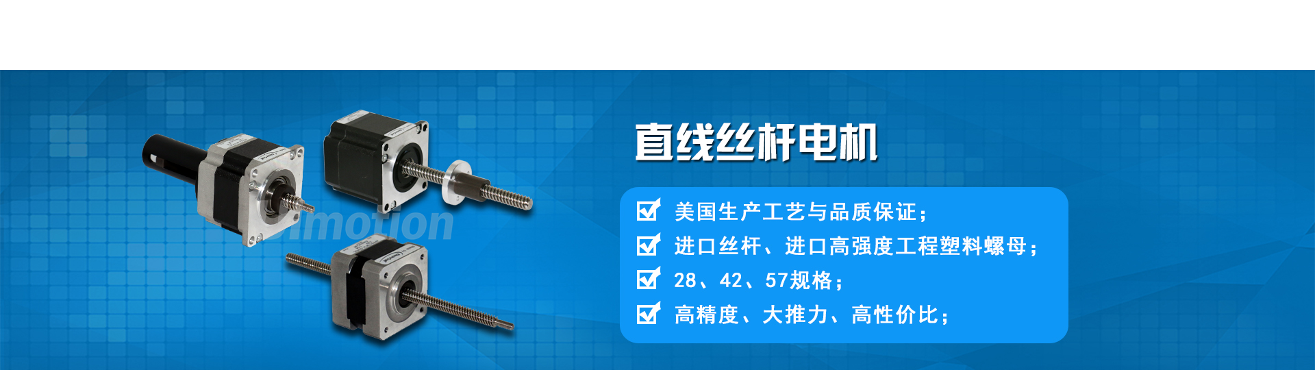 主要產(chǎn)品:高精度絲桿步進(jìn)電機(jī)、一體式步進(jìn)電機(jī)、CAN/RS485/RS232/EtherCAT步進(jìn)驅(qū)動(dòng)器、直流伺服一體機(jī)。